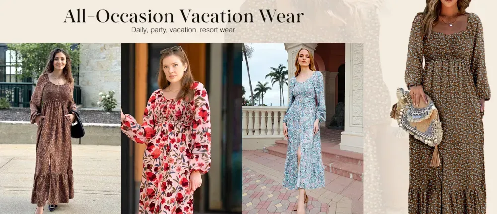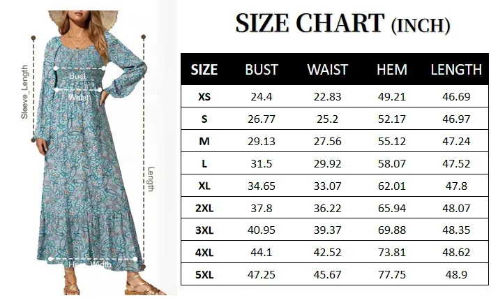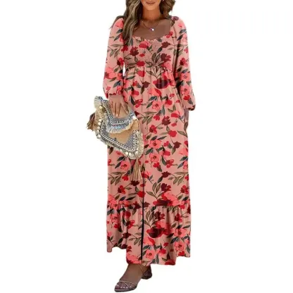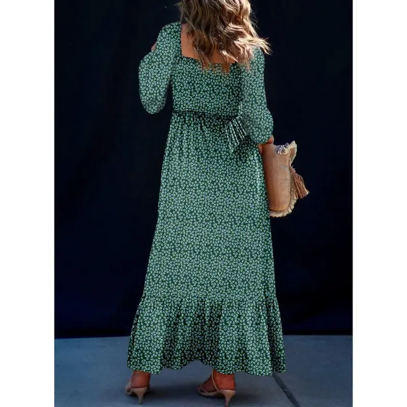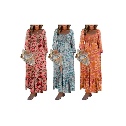 Boho Floral Smocked Square Neck Long Sleeve Maxi Dress