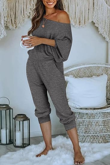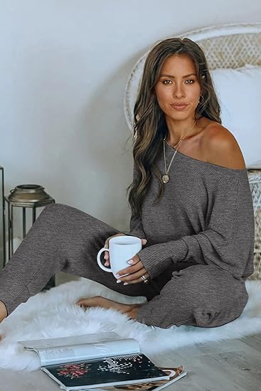 Trendy & Chic Design – Features a stylish off-shoulder pullover and elastic waist sweatpants with pockets for a relaxed yet flattering fit.