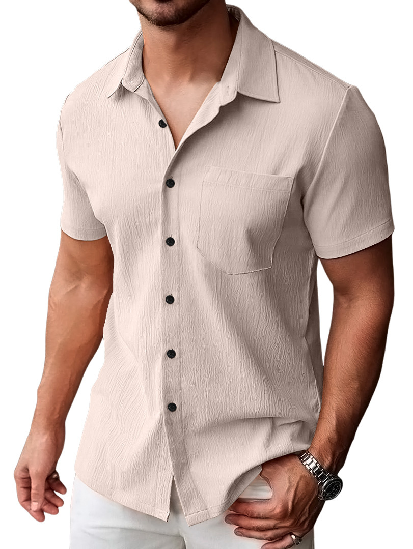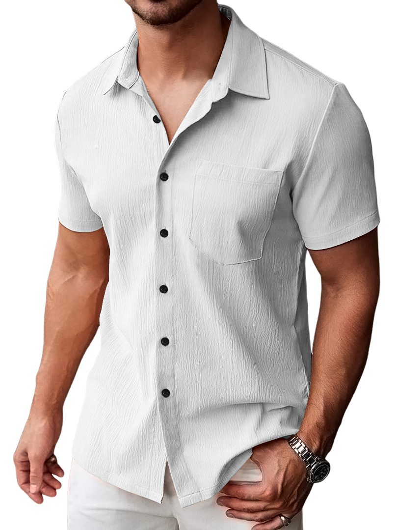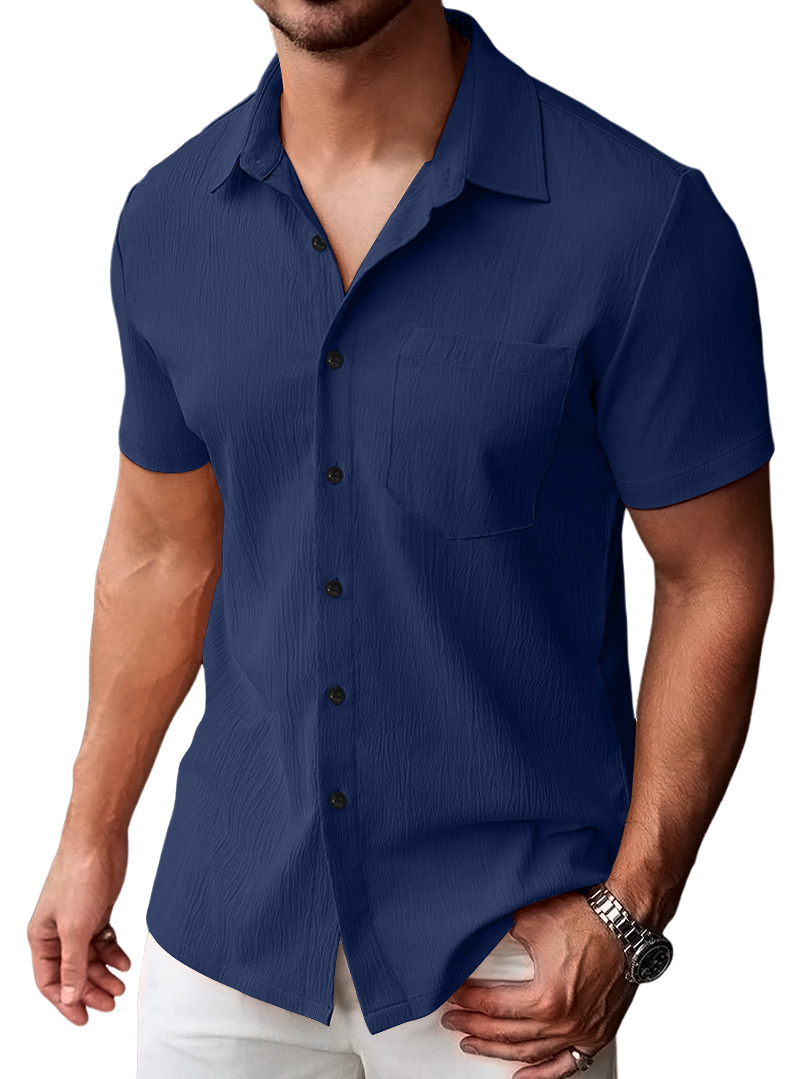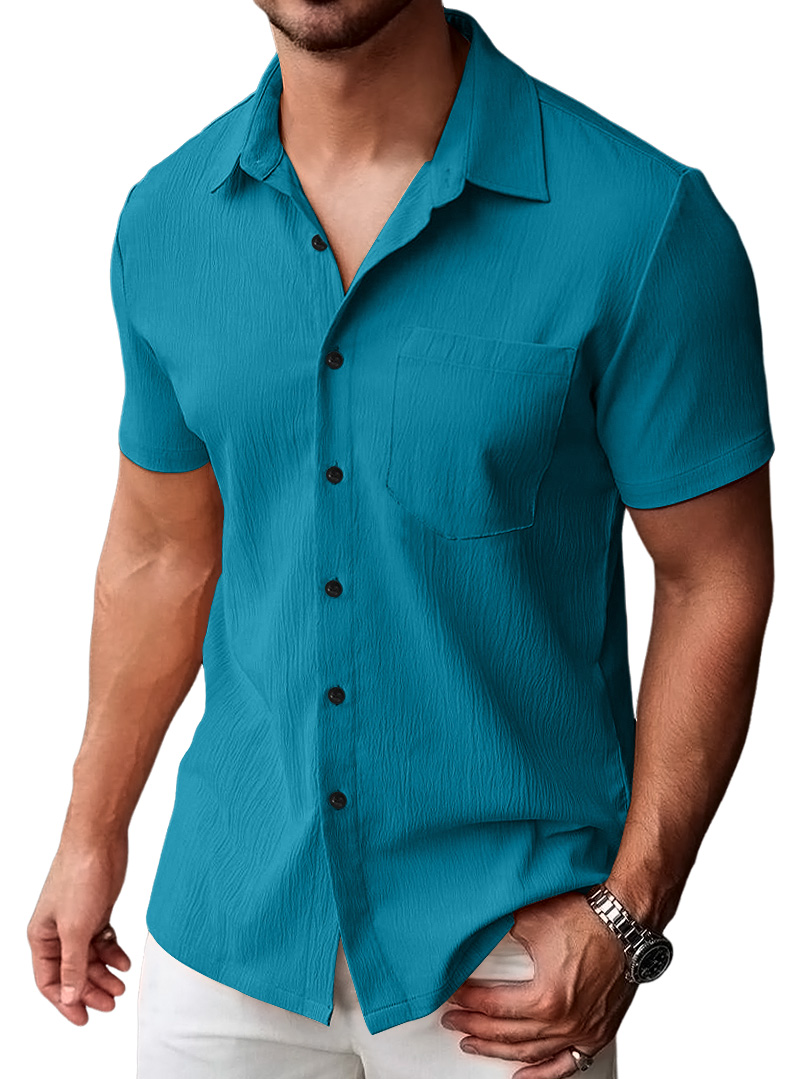 Men's Casual Pleated Solid Pocket Short Sleeve Shirt