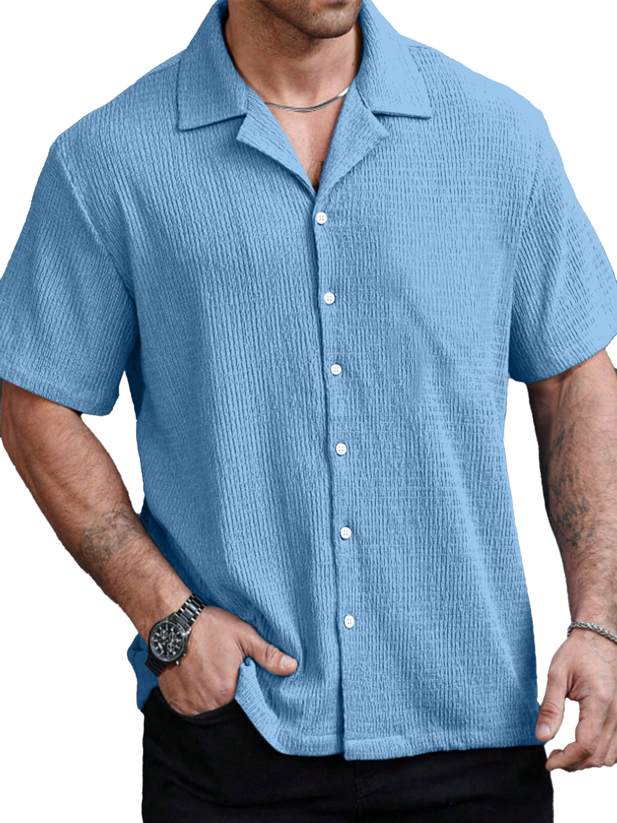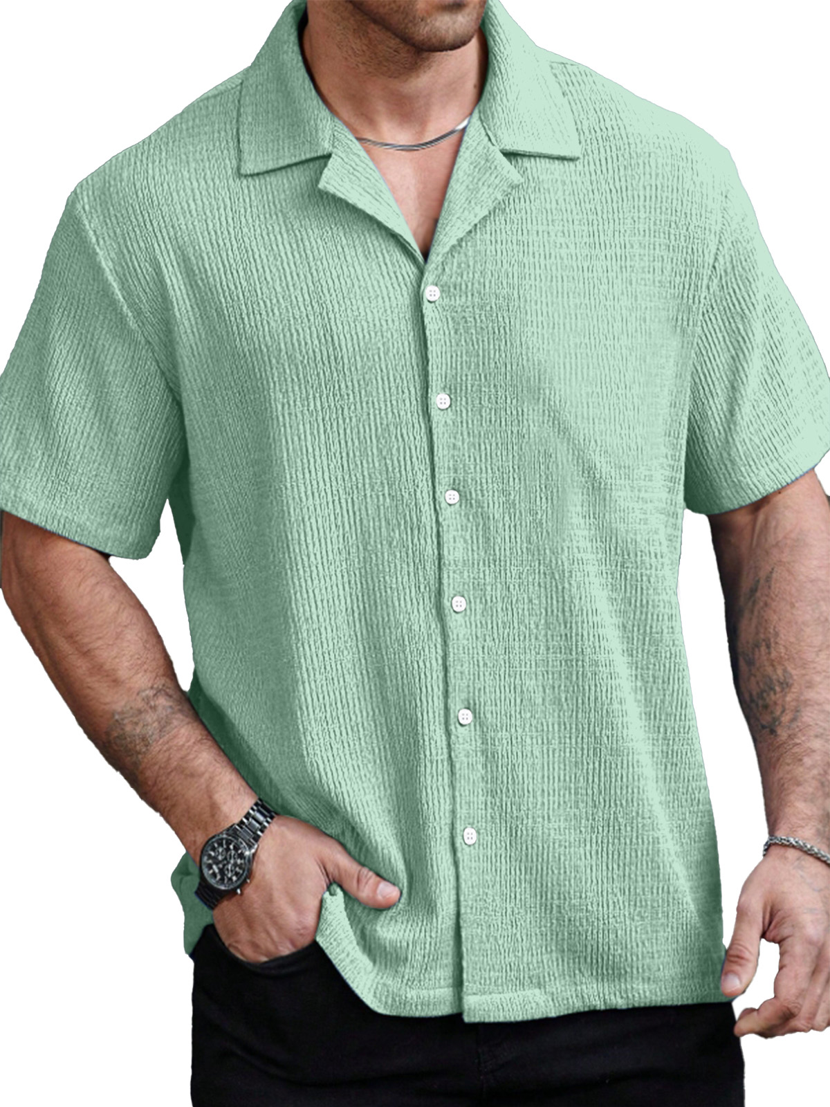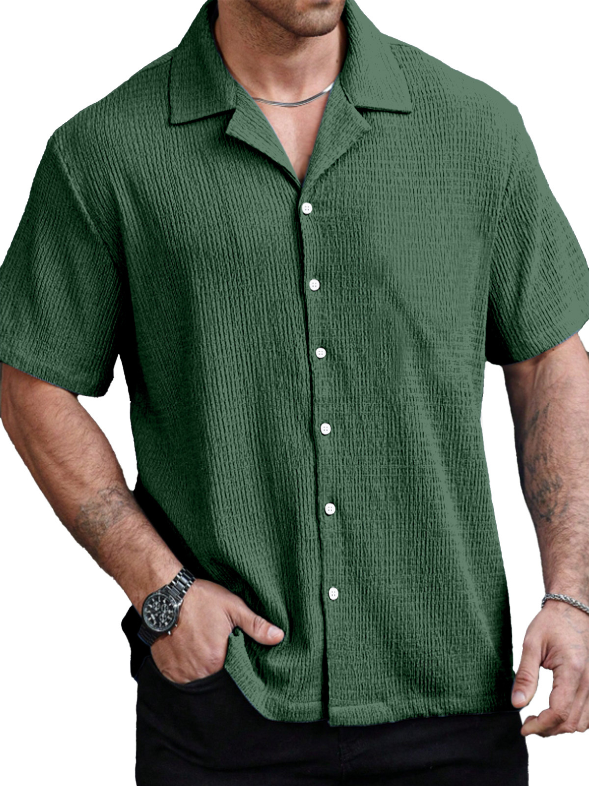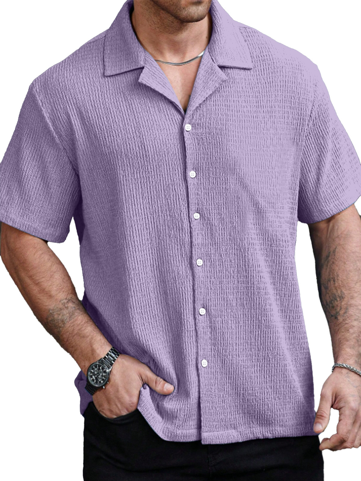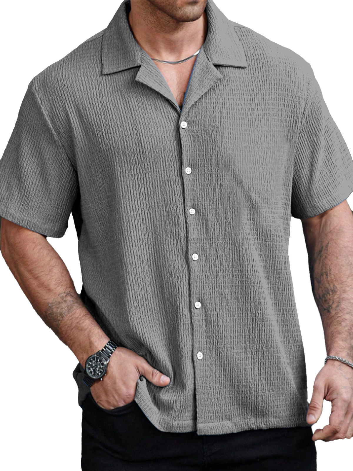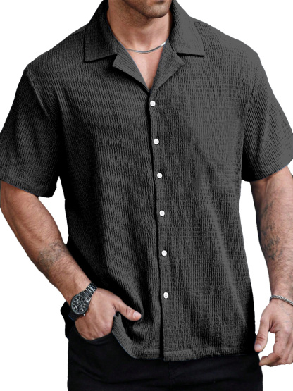 Men's Casual Solid Color Texture Cuban Collar Short Sleeve Shirt