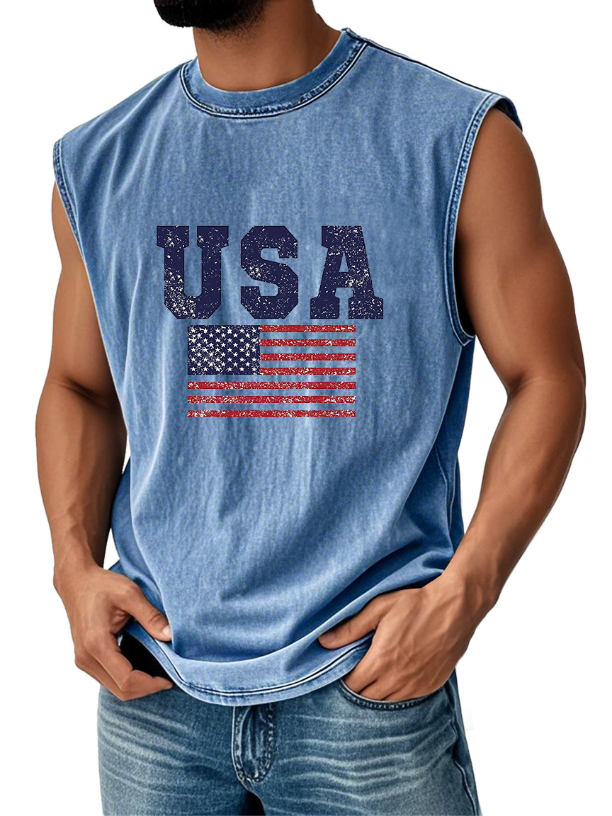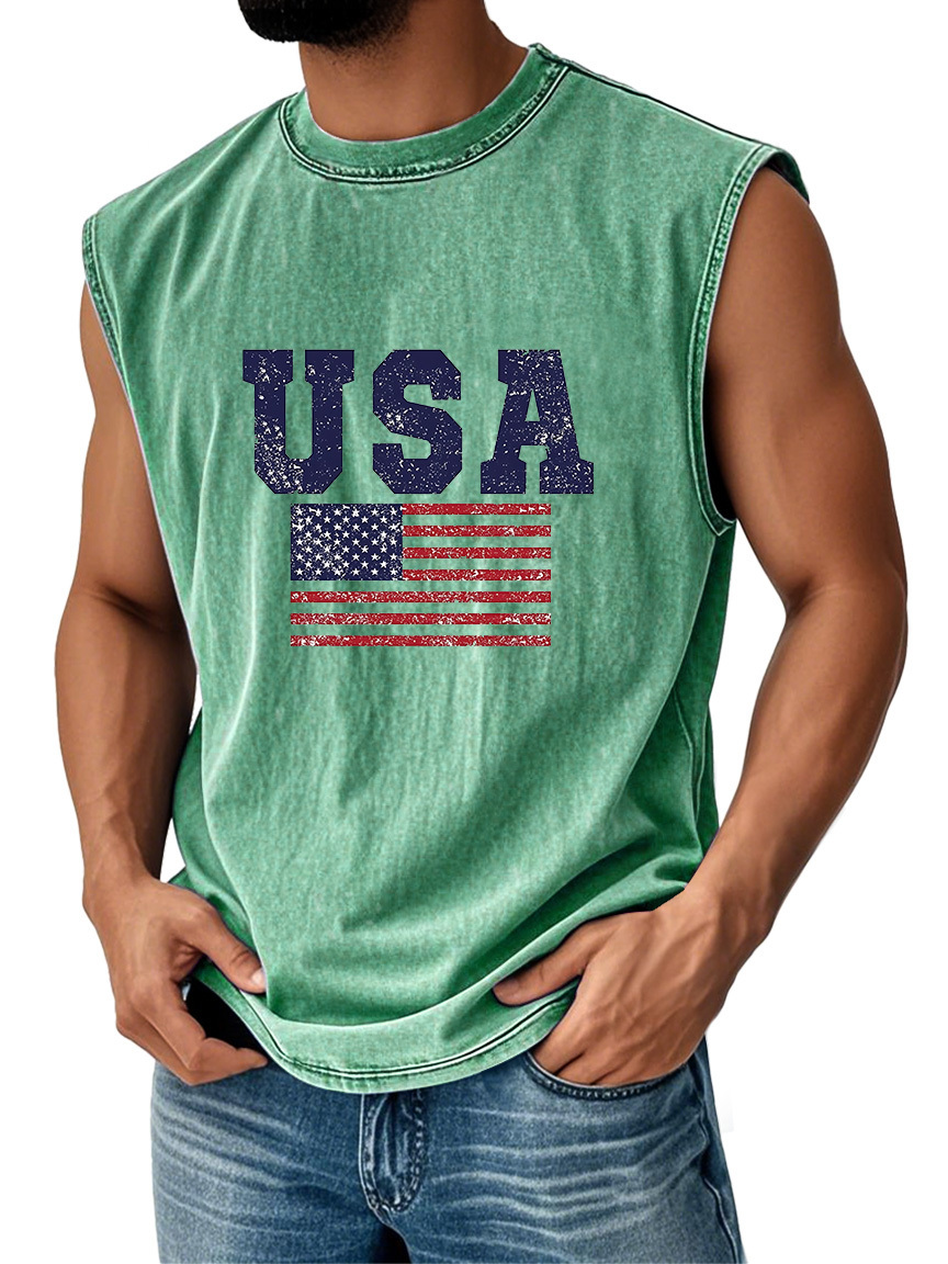 Men's Everyday Vintage American Independence Day Flag Printed Crew Neck Sleeveless Tank Top