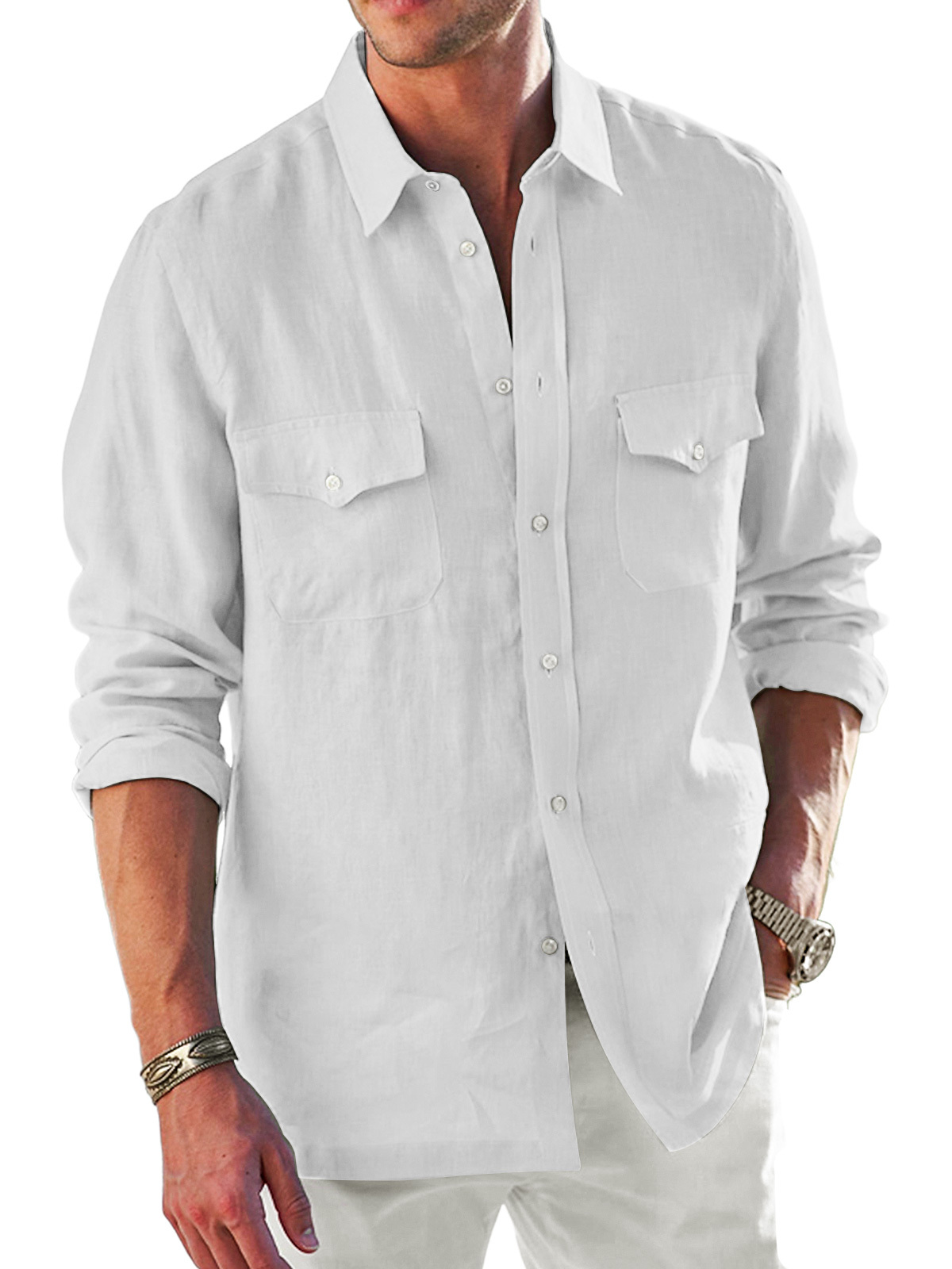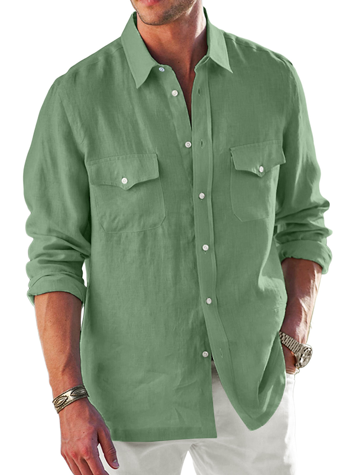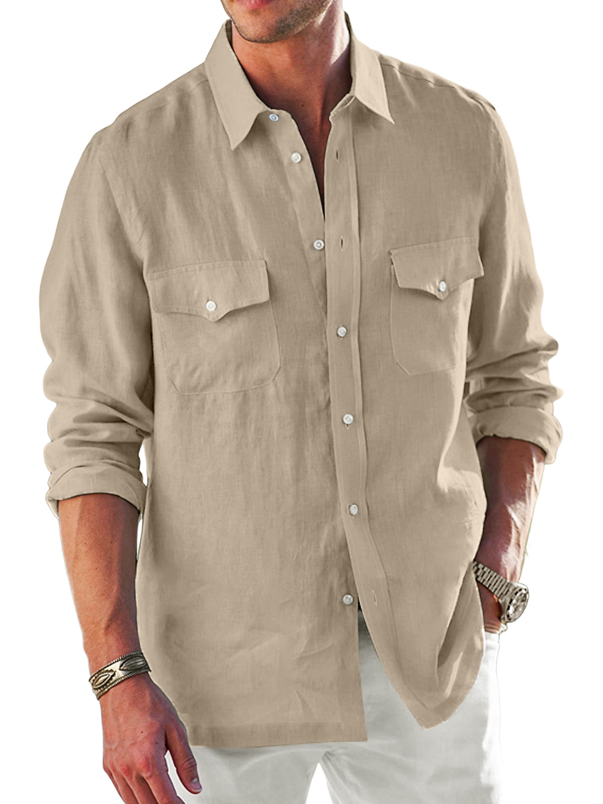 Men's pure cotton double pocket lapel comfortable solid color casual long sleeve shirt