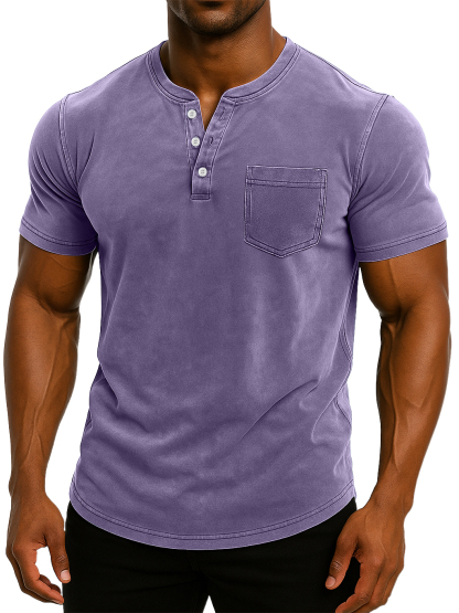 Men's Retro Stand Collar Casual Pocket Solid Color Slim Fit Short Sleeve Henley Shirt