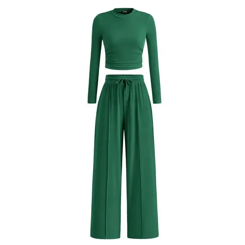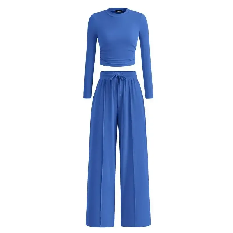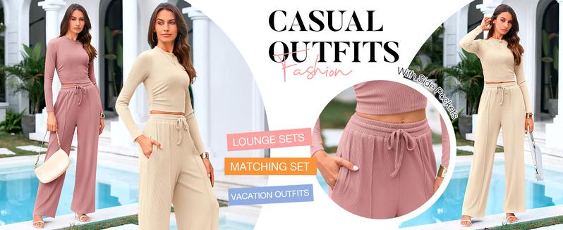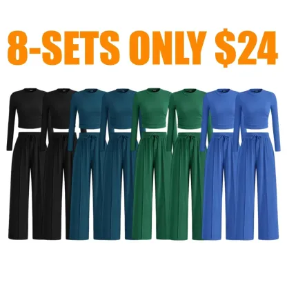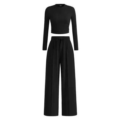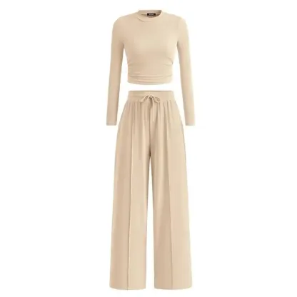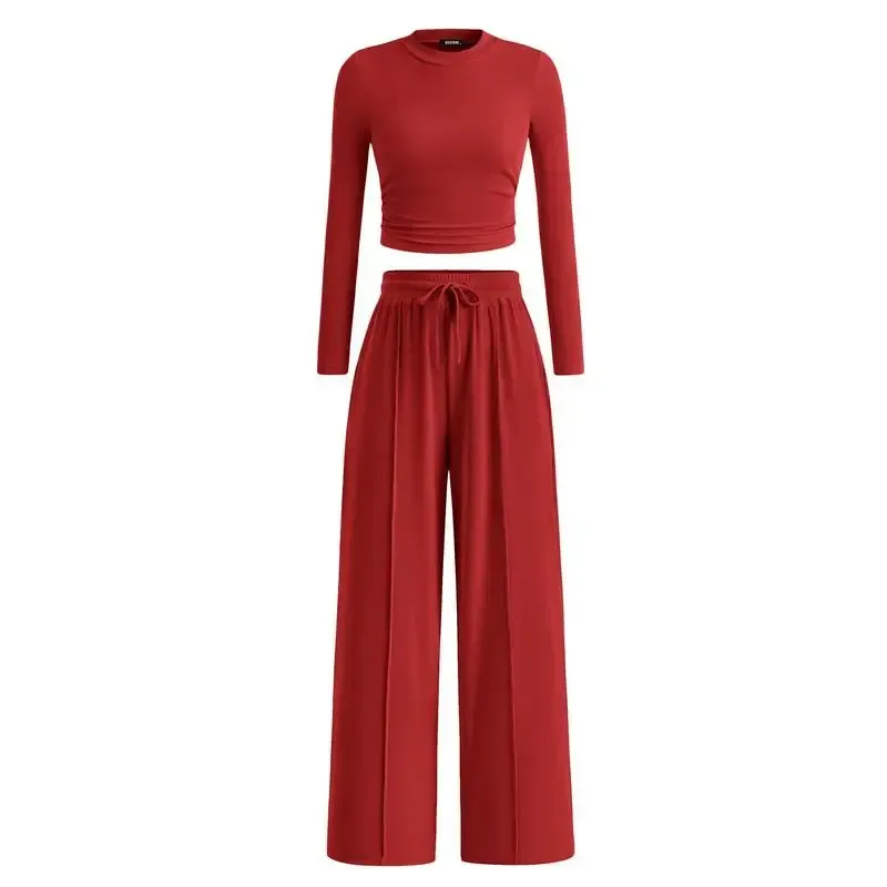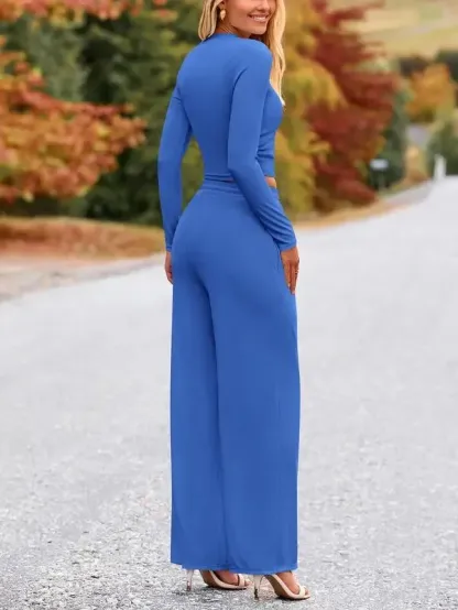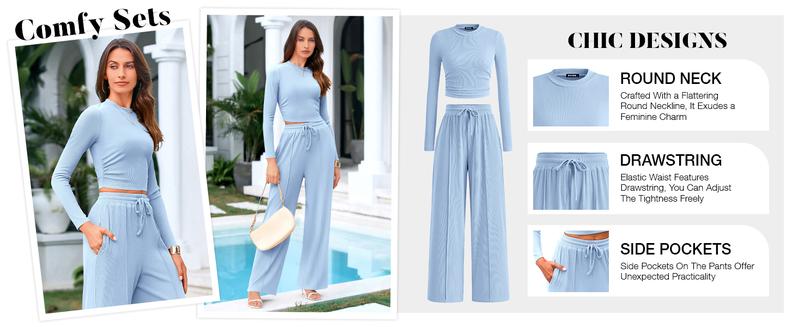 Ribbed Knit Long Sleeve Crop Top Wide Leg Pants