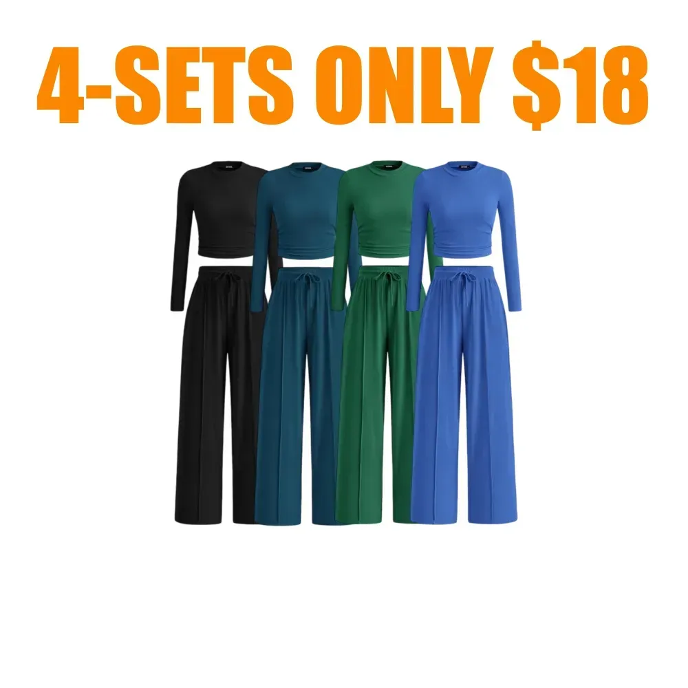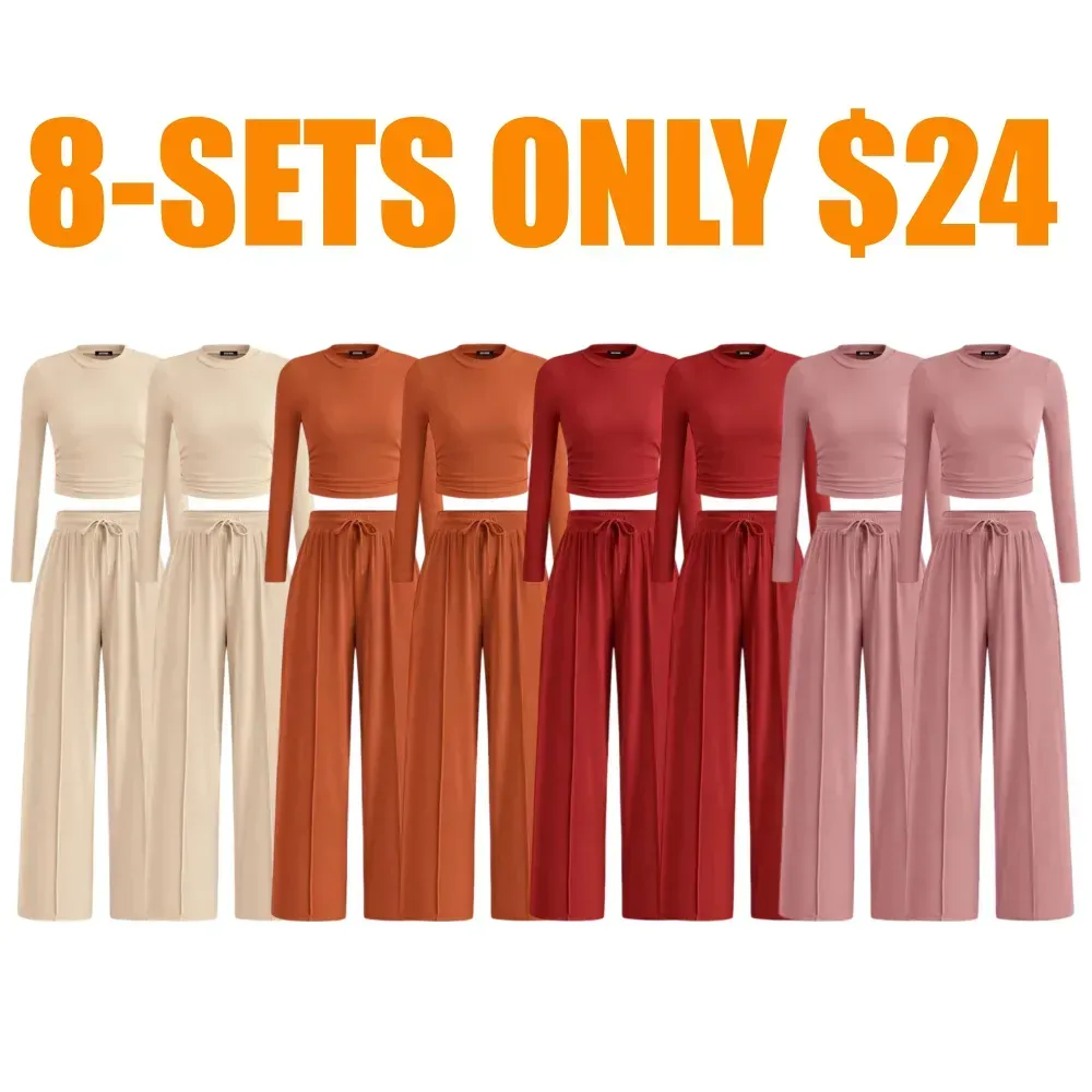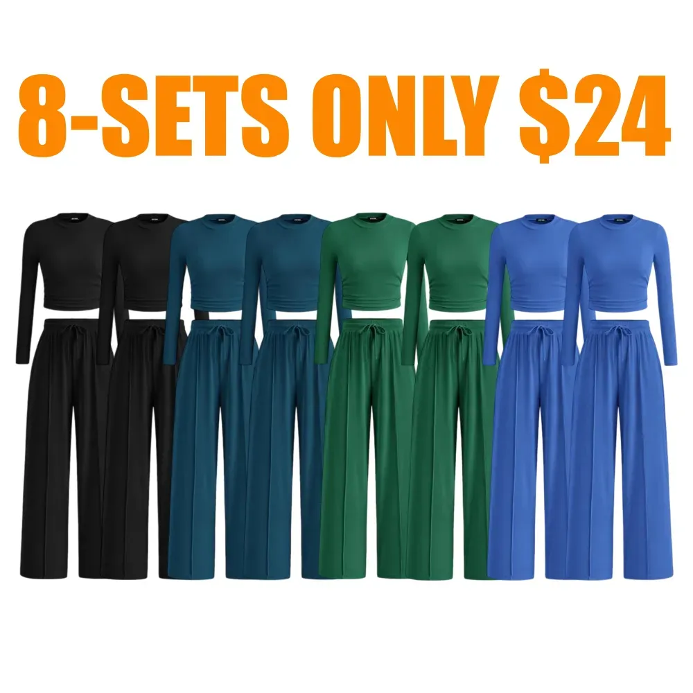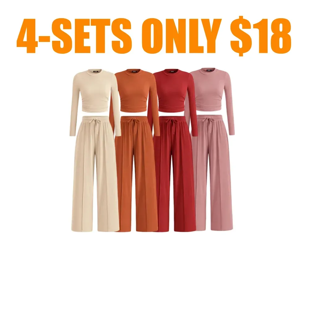 Ribbed Knit Long Sleeve Crop Top Wide Leg Pants