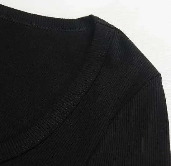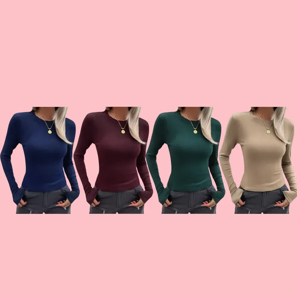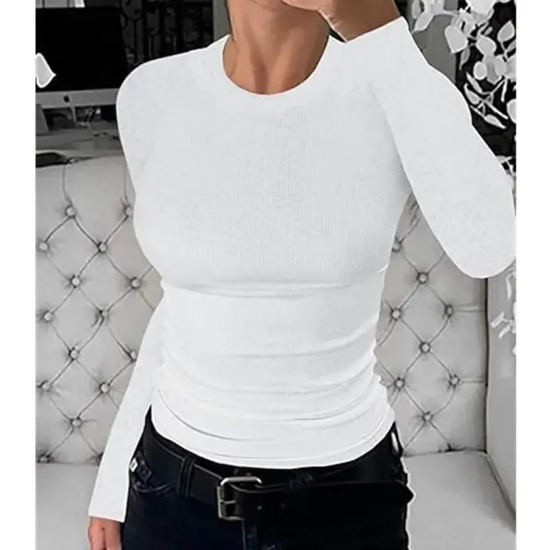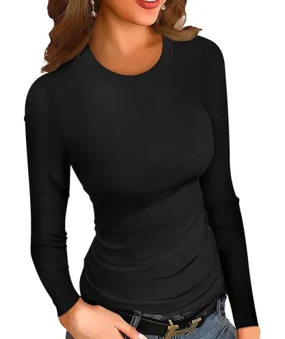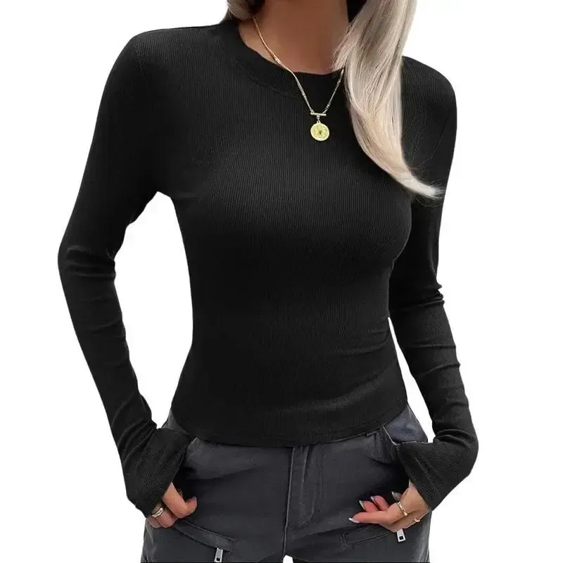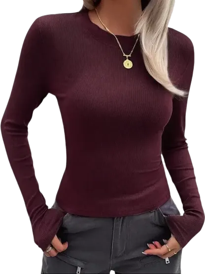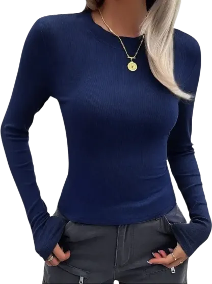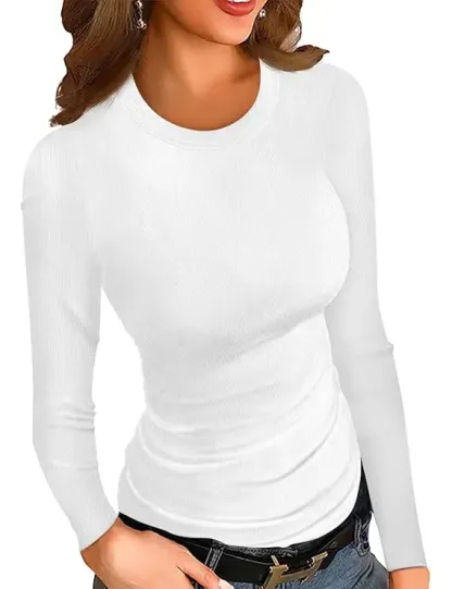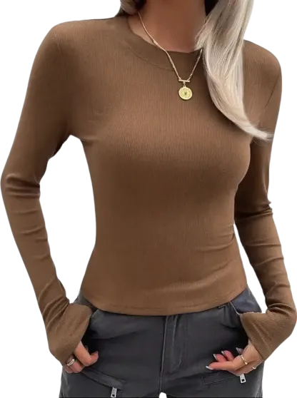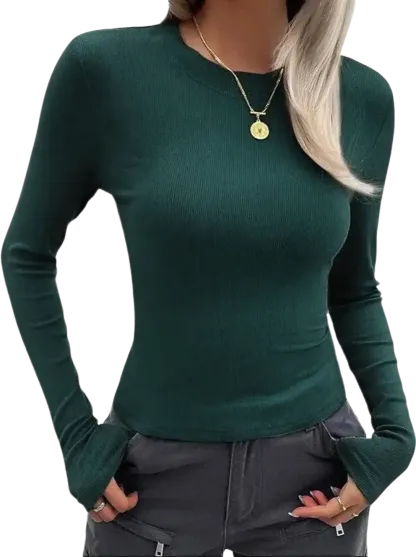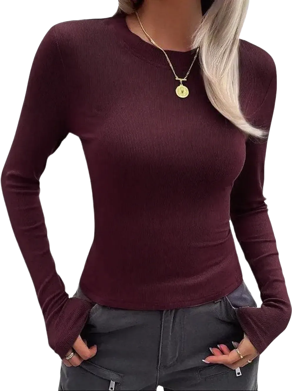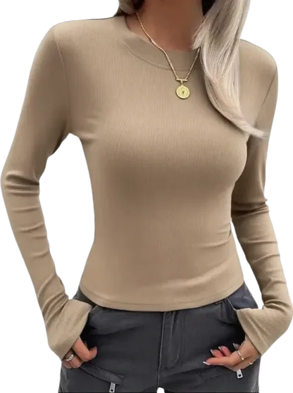 Women Long Sleeve Stretch Slim Round Neck Ribbed Basic Top