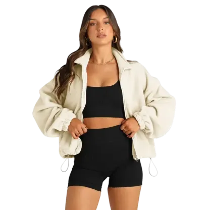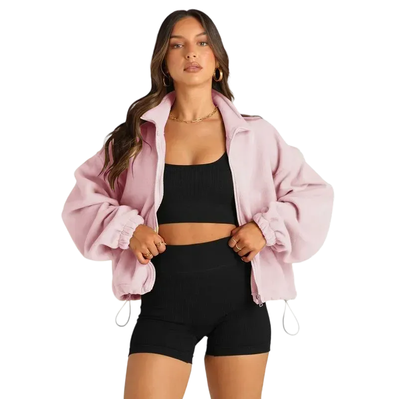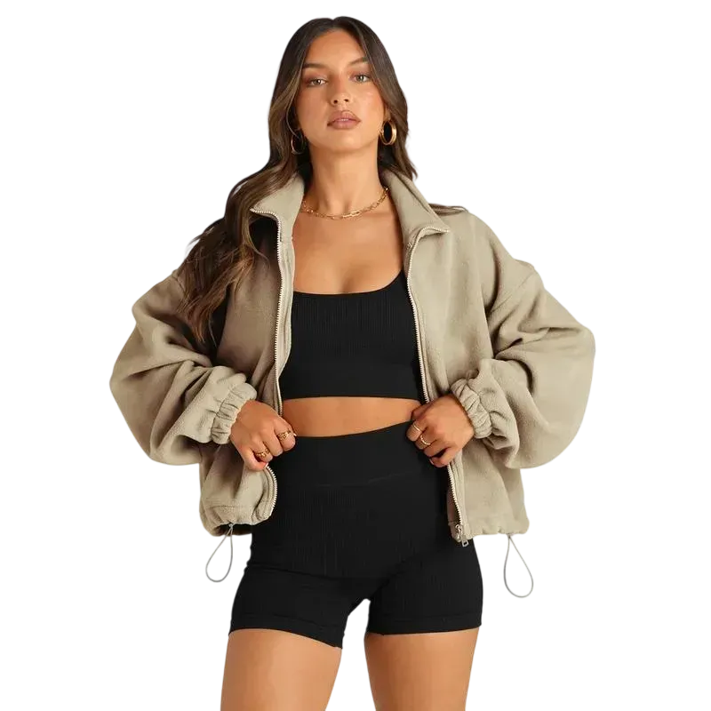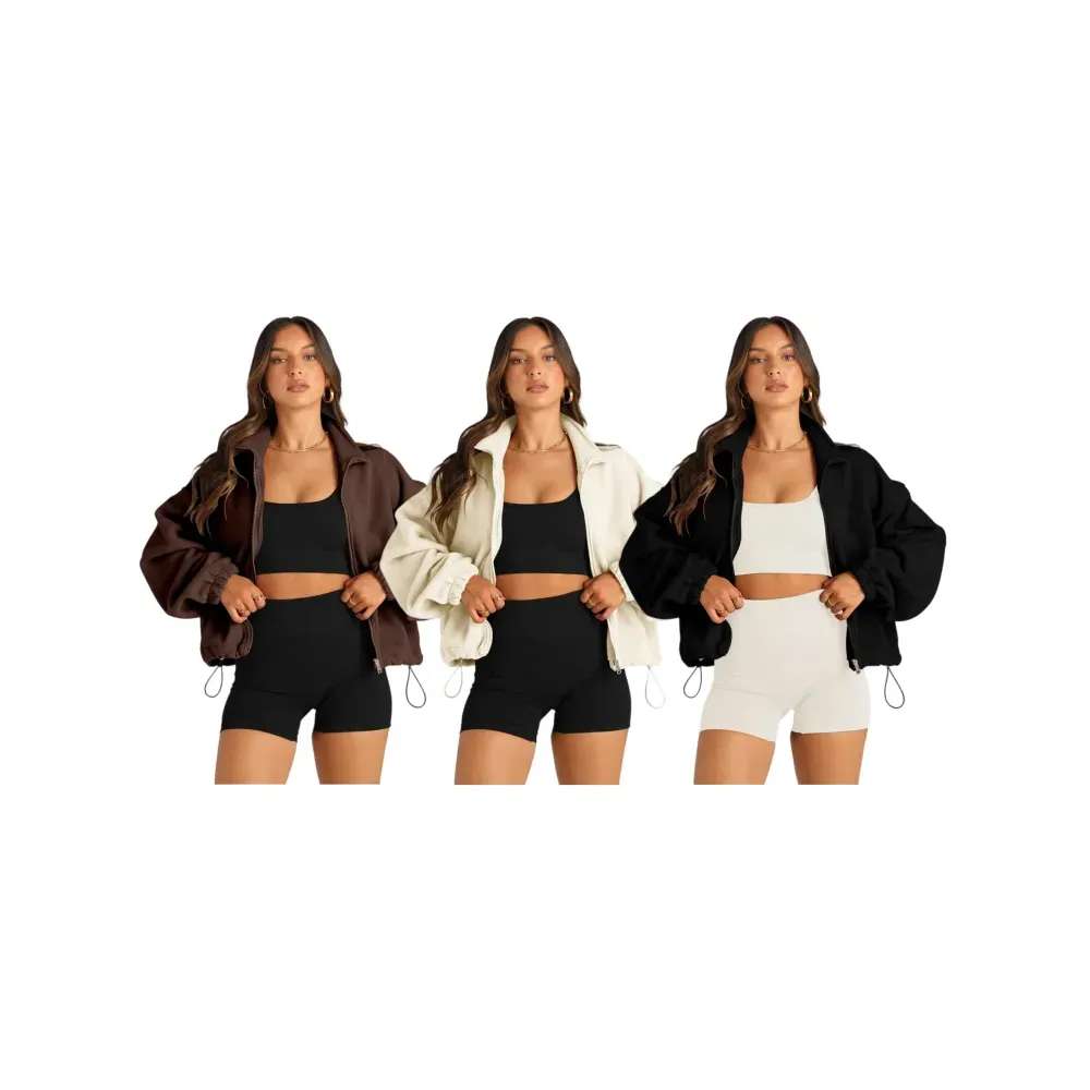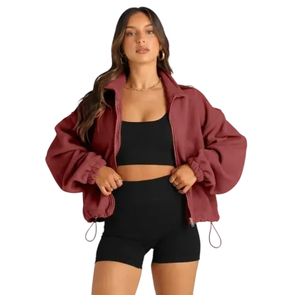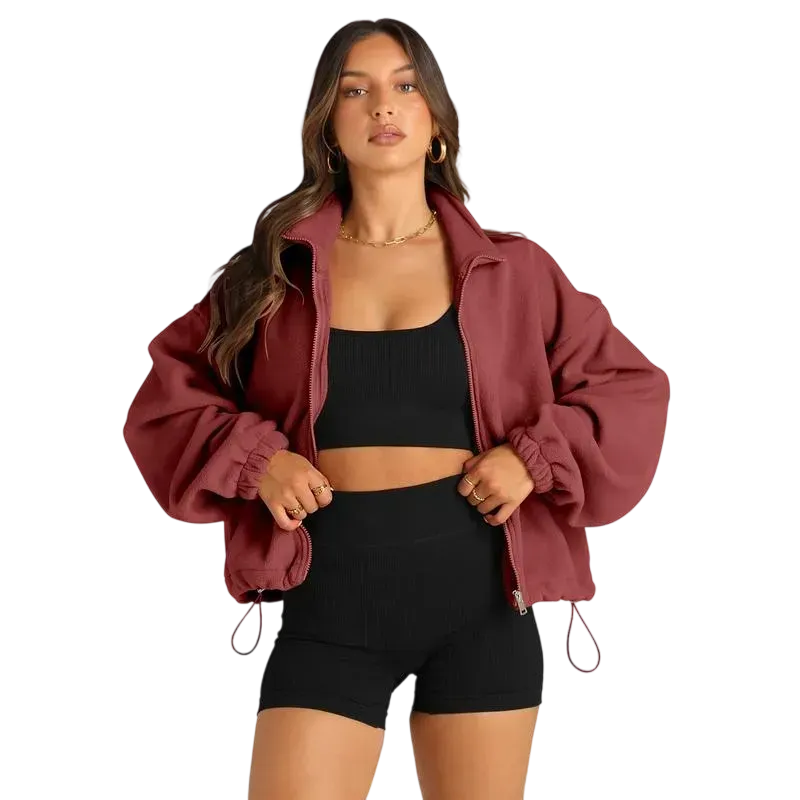 Women's Winter Stand Collar Sherpa Crop Coat fits nicely over a yoga