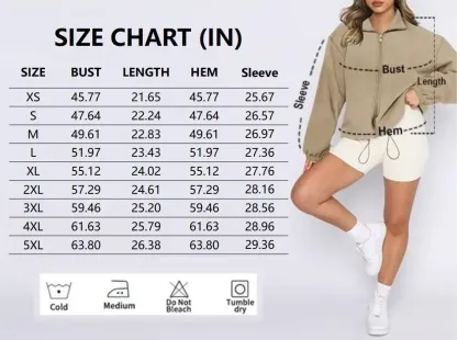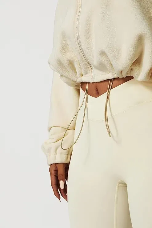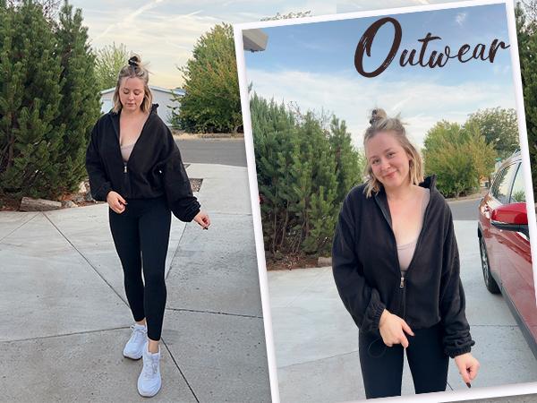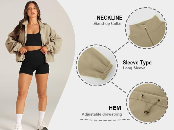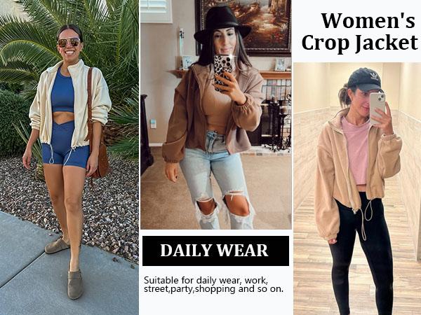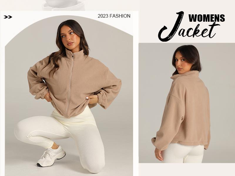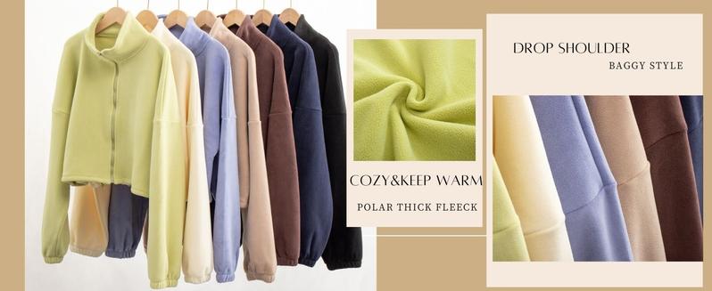 MATERIAL: 95% Polyester, 5% Spandex,Super soft touch feeling polar fleece brings both warmth and cozy in temperatures above 32¨H degrees,this highly polar fleece jacket provides comfort after sweating or daily fashion. Easy to care for and easy to wear, you'll love the effortless look and feel anywhere you go. The Features: Featuring a 20"(shoulder to hem measured size s) short jacket design, Full zip up and stand collar,bungee at hem and keep the cold out,Baggy,Cropped length,Perfect winter outfit for your jeans, legging, or any pants.