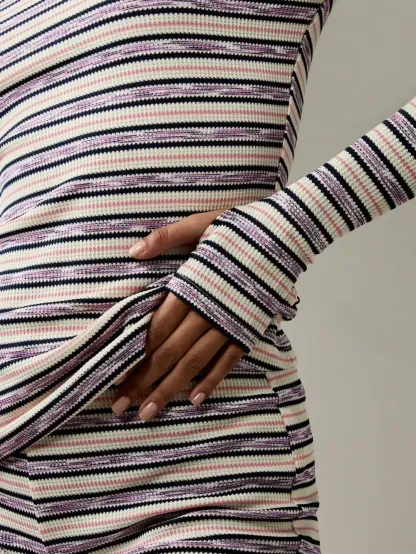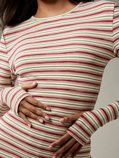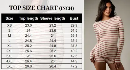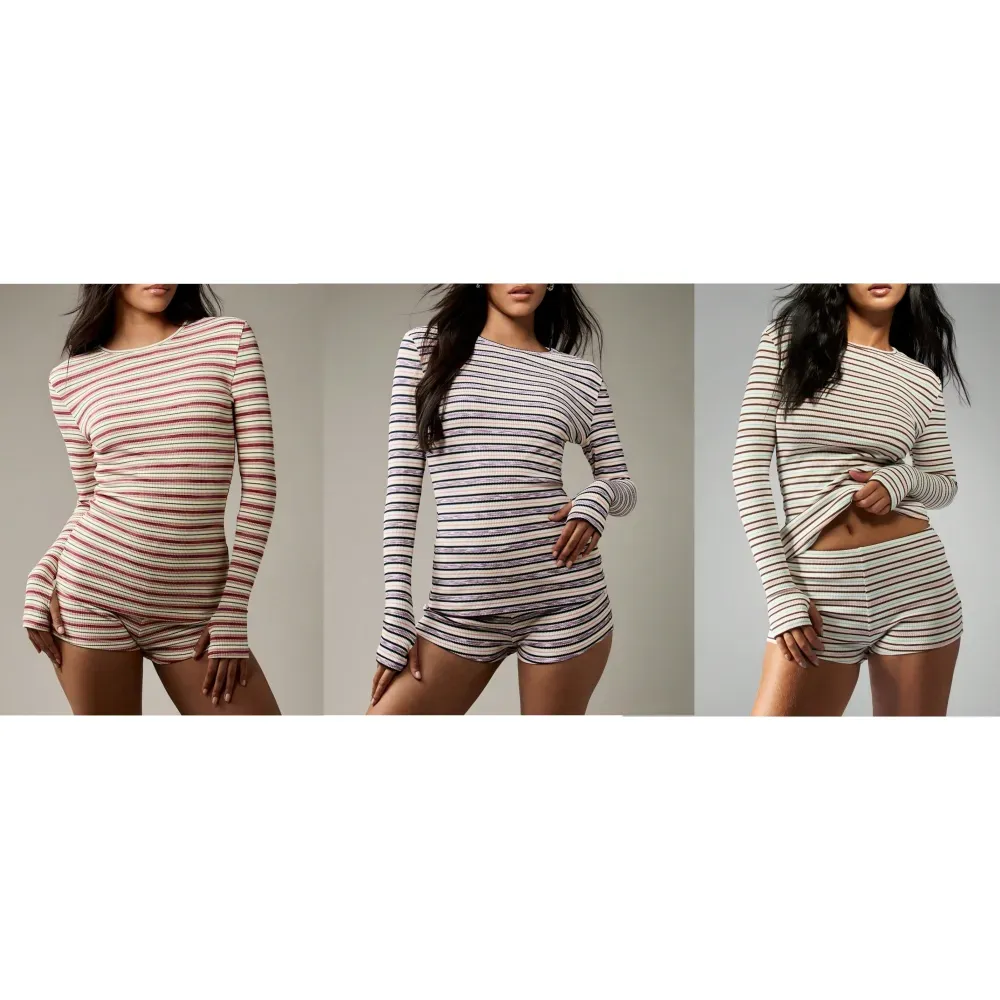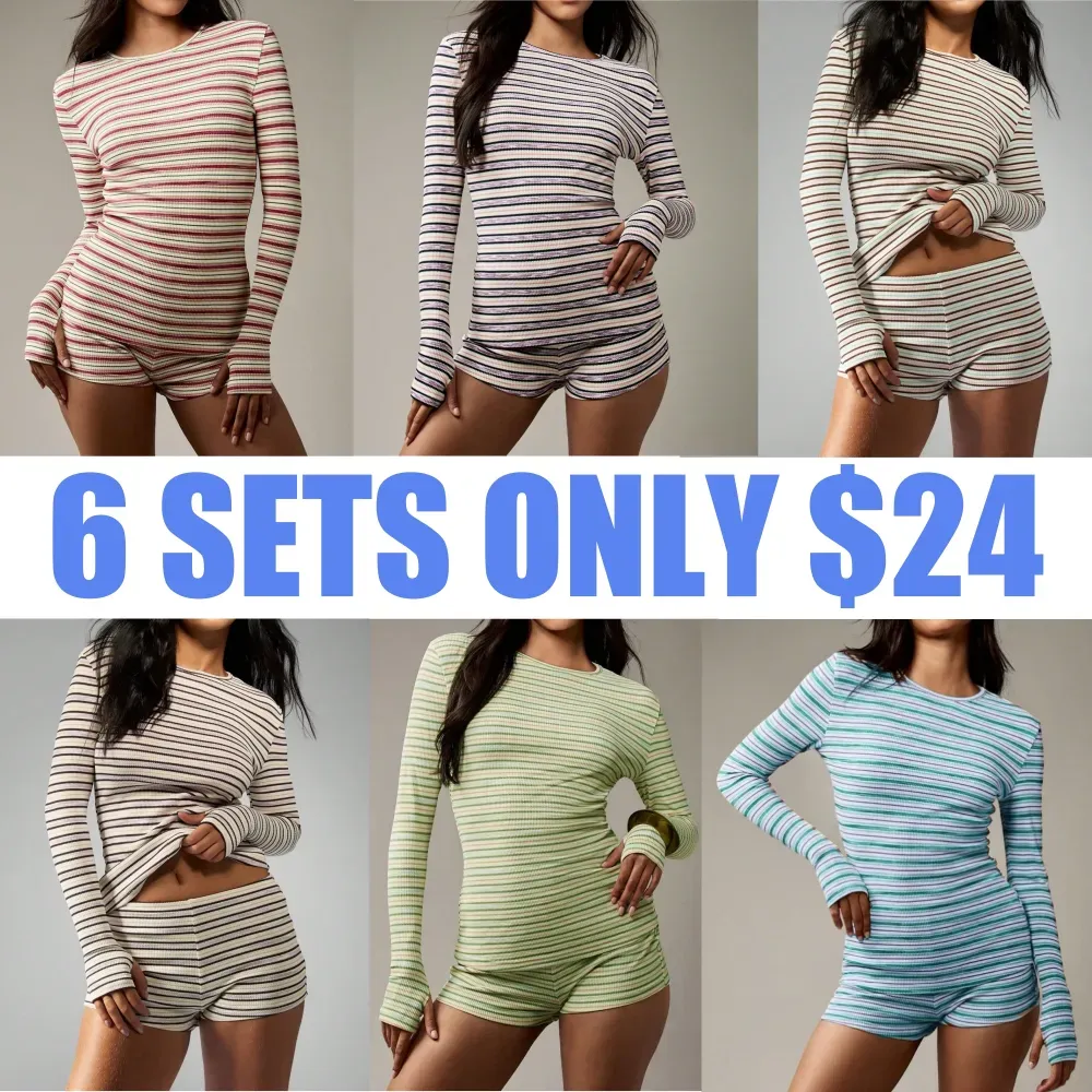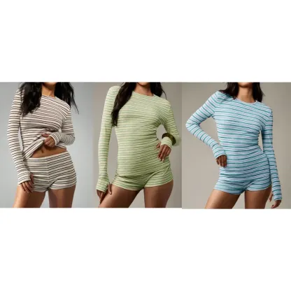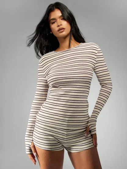 Women's Striped Knit Long Sleeve Top & High Waist Sporty Shorts Set